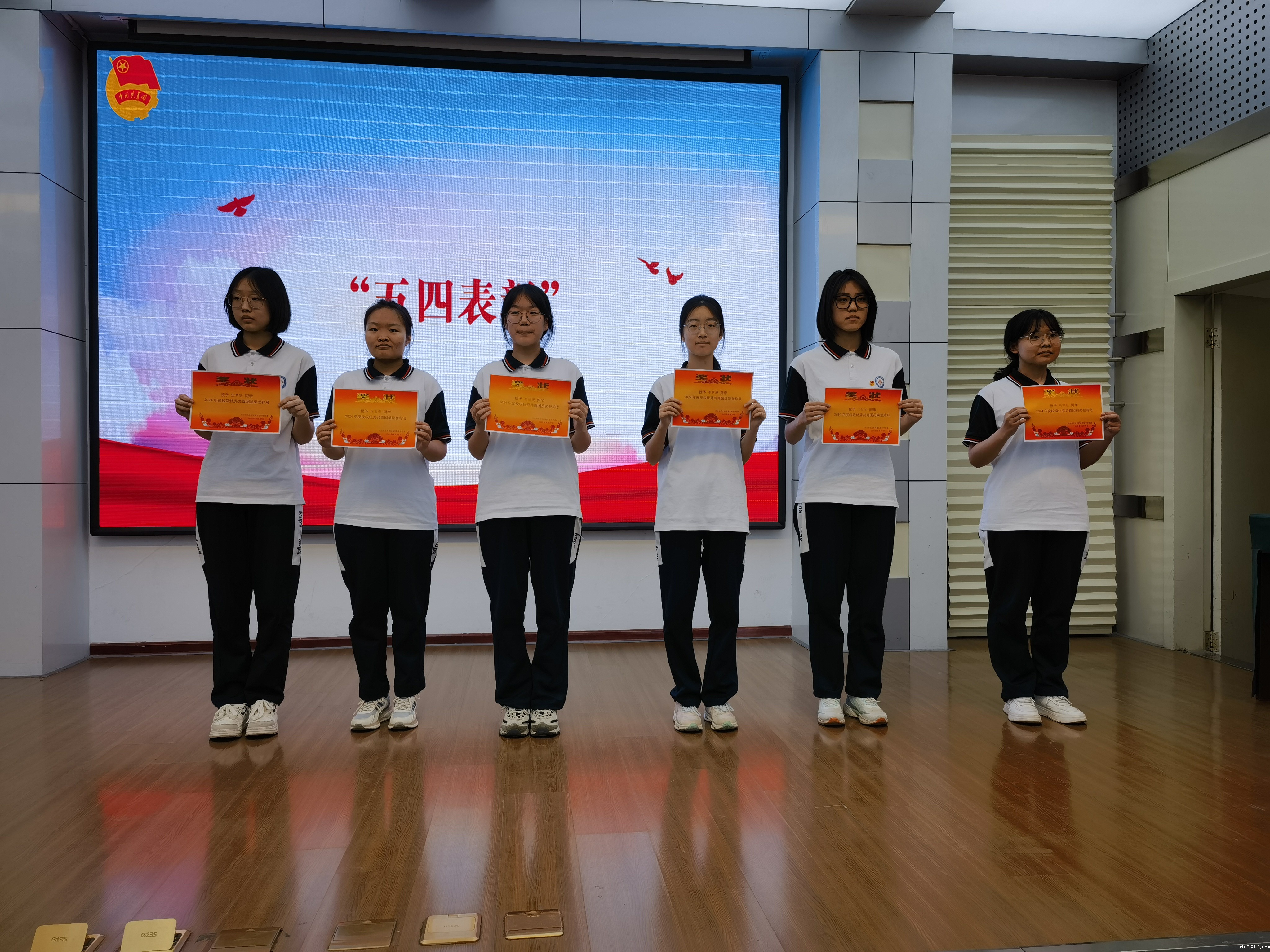 国歌奏毕,团委书记李克娇宣读了“五四”表彰名单。本次表彰旨在激励广大团员青年积极进取、奋发向上,树立优秀榜样。在热烈的掌声中,受表彰的个人和集体依次上台,团委书记李克娇和少先队总辅导员吕晓慧为他们颁发奖状。一张张荣誉证书,不仅是对获奖者过去成绩的肯定,更是对他们未来继续拼搏的期许。这些优秀的团员青年,用实际行动诠释了新时代青年的责任与担当,为全体同学树立了学习的标杆。